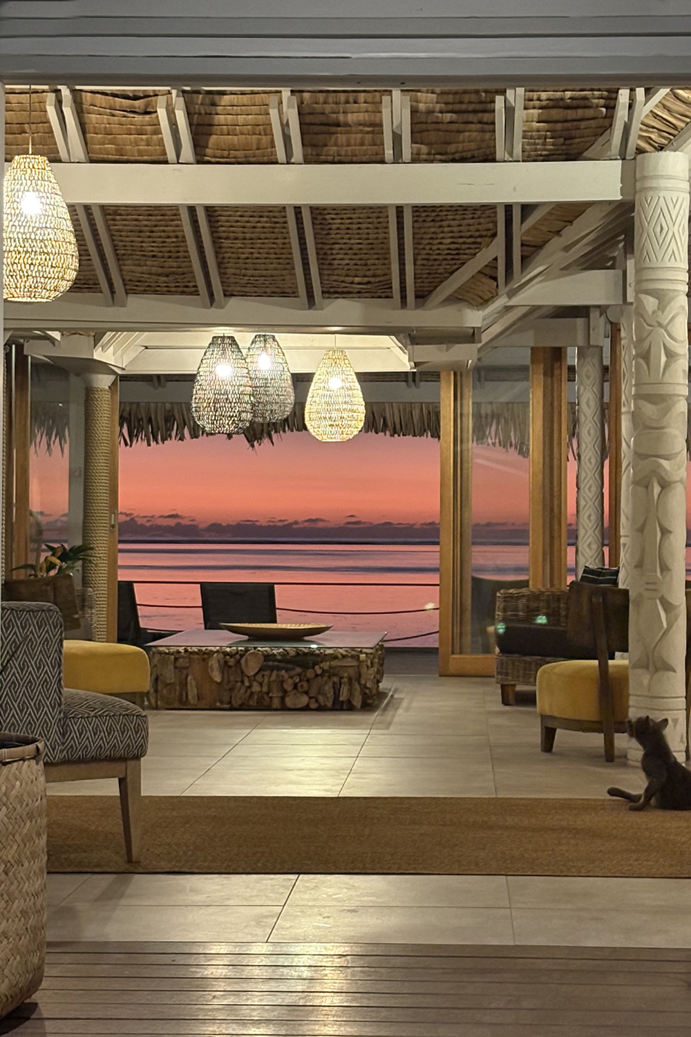 The Lounge house is the main space of the hotel. It is a place dedicated to relaxing but also to exchange with others. The bar facing the lagoon opens onto a large living-room area then onto a terrace and finishes onto an outdoor lounge overlooking the white sand beach.